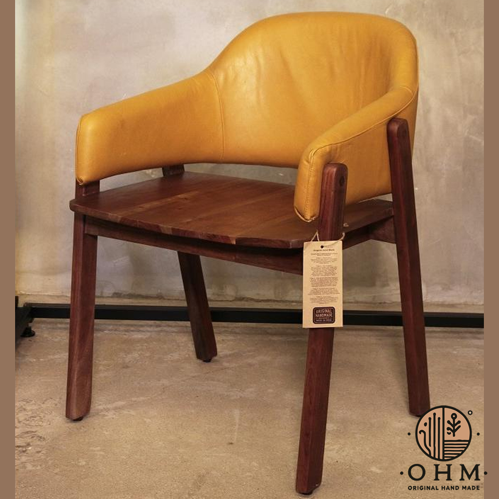 Cadeira com estrutura robusta em madeira maciça de Acácia e encosto estofado em couro amarelo mostarda de Grão superior. Design arrojado que combina o equilíbrio perfeito entre conforto, sofisticação e autenticidade artesanal.